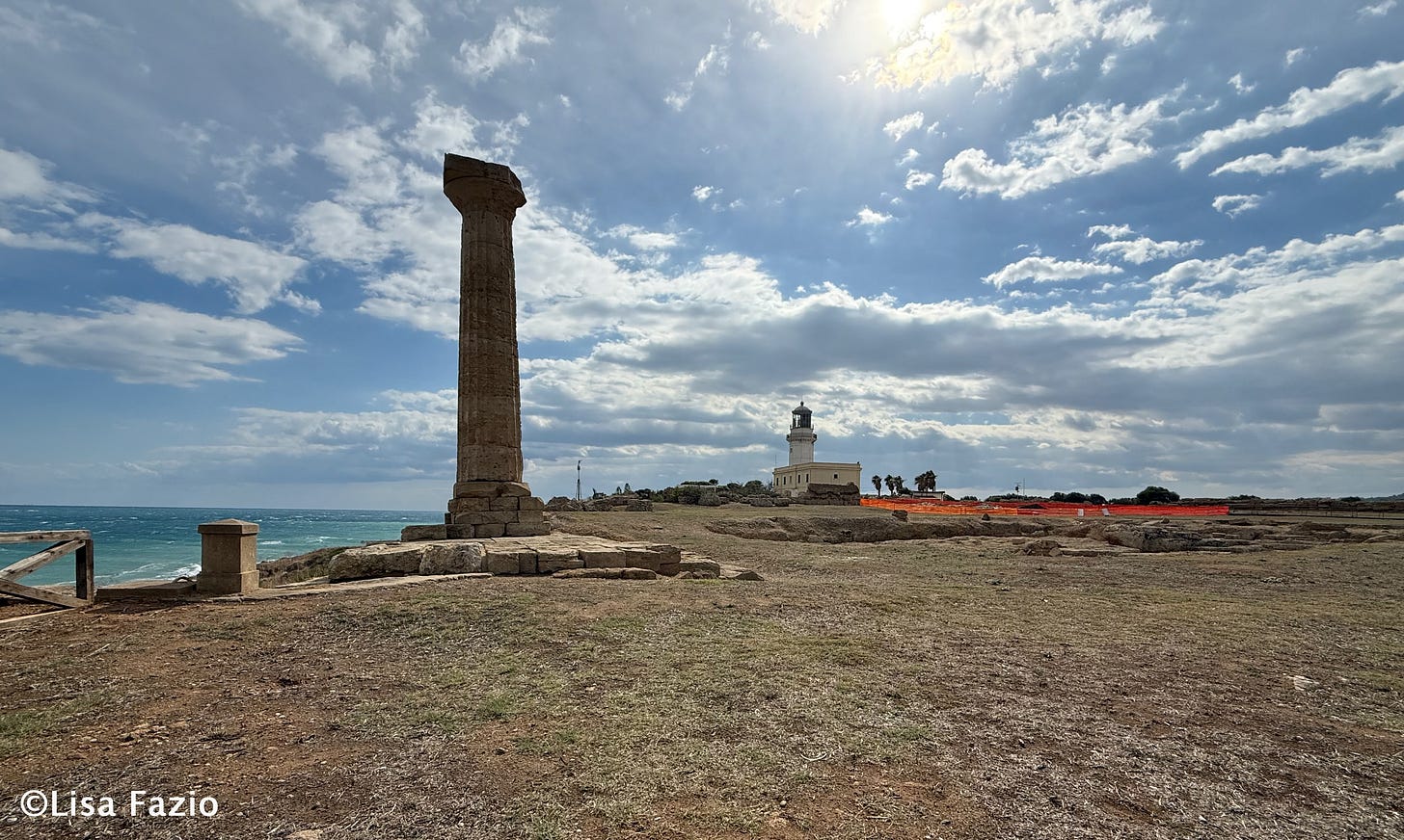 I recently visited Crotone, for the second time, and the “Gardens and Museum of Pythagoras” that is tended and curated by the modern city. I also made a second visit to promontory of Capo Colonna which is where the ruins of the Greek temple to Hera Lacinia remains along side what’s left of a Roman outpost and what is one of the oldest churches in Crotone, the shrine to the Madonna of Capo Colonna.